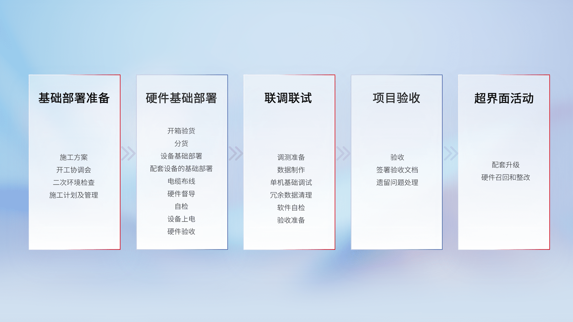 从基础部署准备、、、硬件基础部署、、联调联试、、项目验收、、、、越界面活动的全过程可追溯,,,,保证施工质量和进度。。。